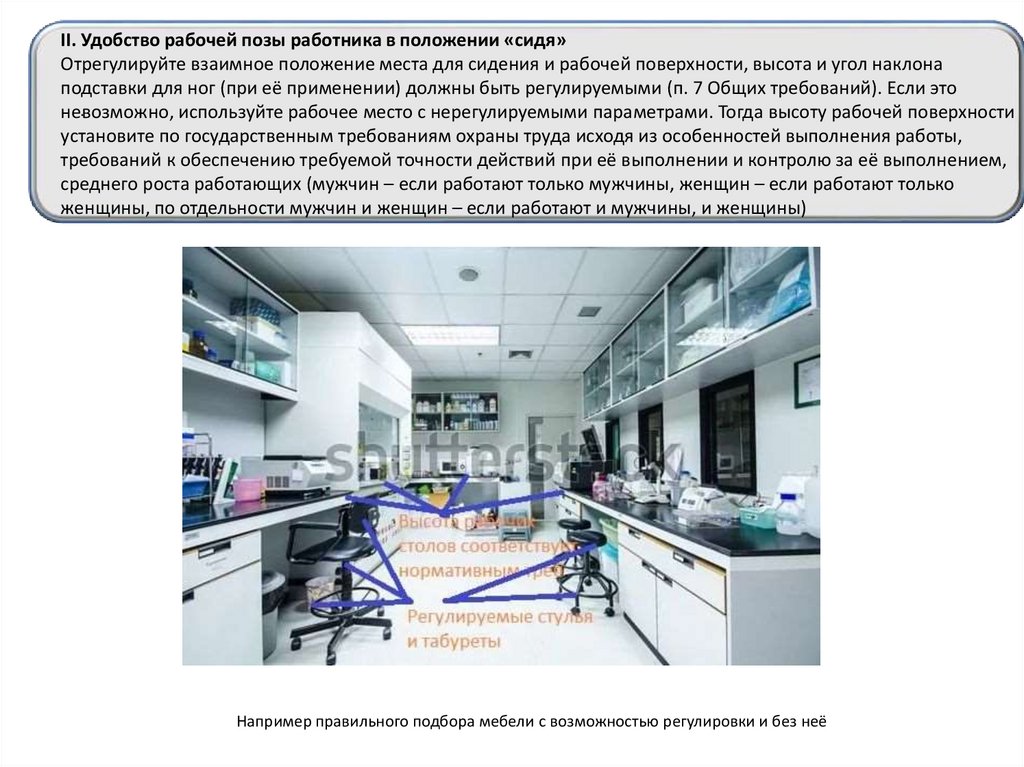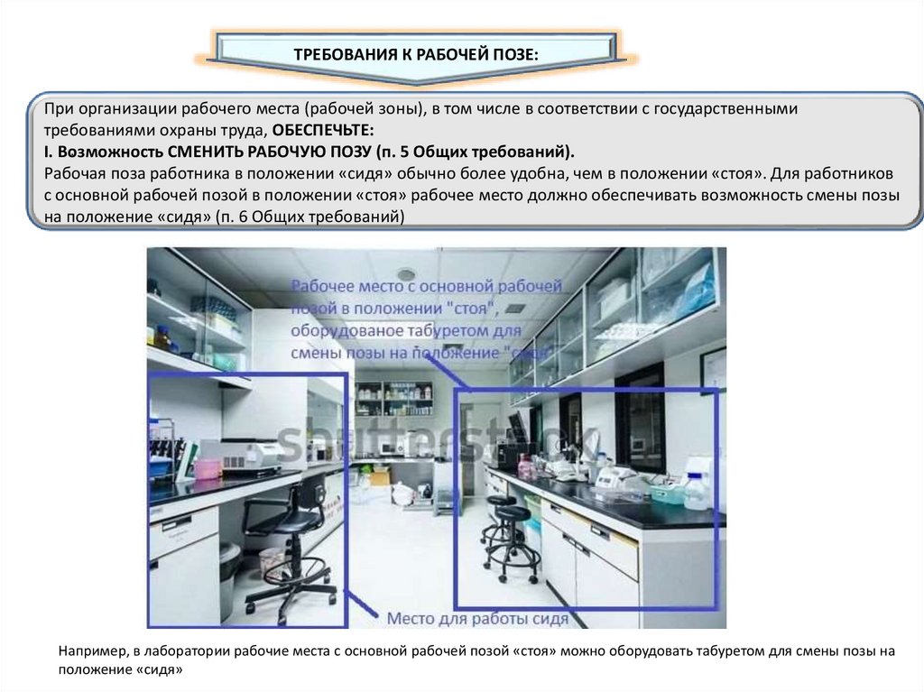 Например, в лаборатории рабочие места с основной рабочей позой «стоя» можно оборудовать табуретом для смены позы на