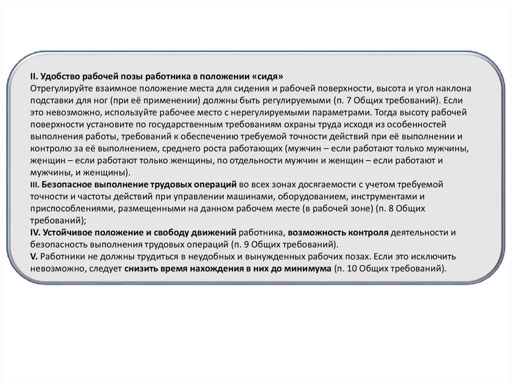 II. Удобство рабочей позы работника в положении «сидя»Отрегулируйте взаимное положение места для сидения и рабочей поверхности, высота и угол наклона