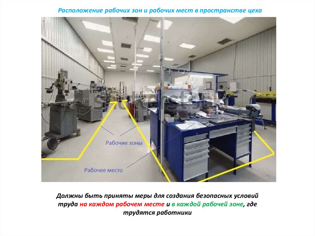 Расположение рабочих зон и рабочих мест в пространстве цехаДолжны быть приняты меры для создания безопасных условий