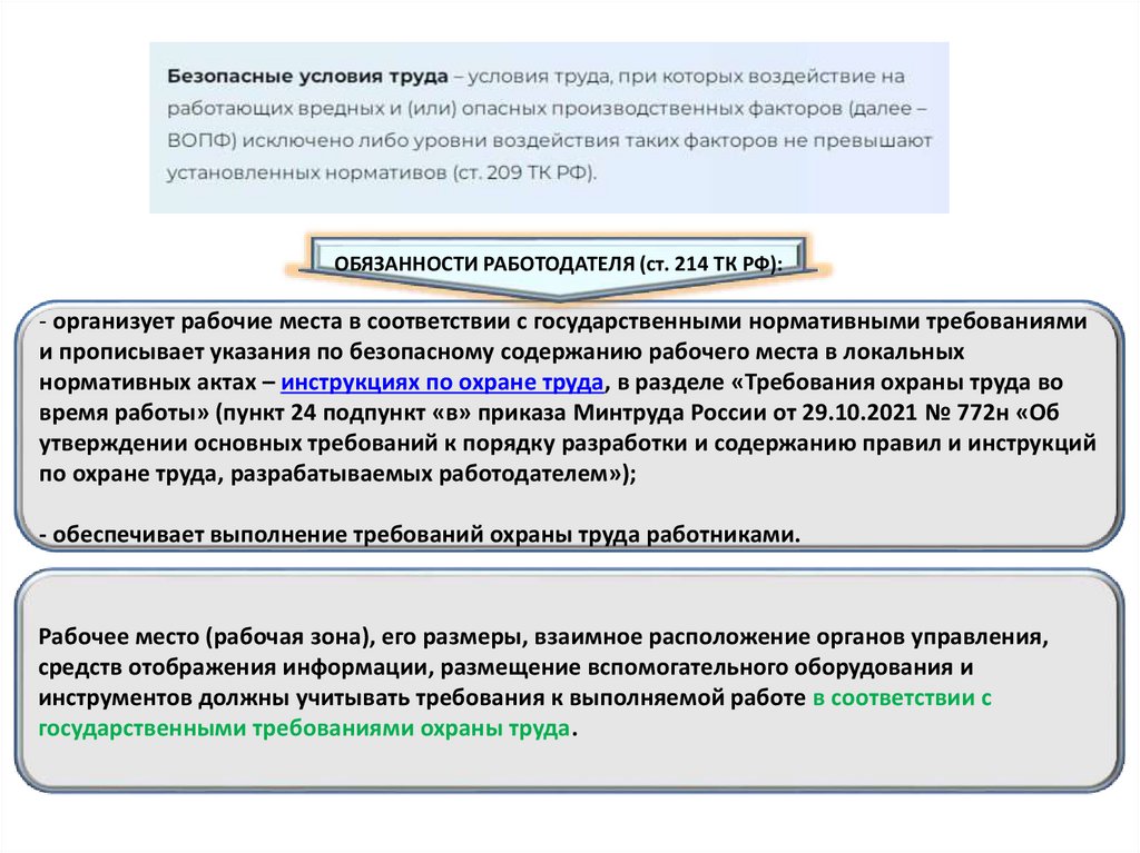 ОБЯЗАННОСТИ РАБОТОДАТЕЛЯ (ст. 214 ТК РФ):- организует рабочие места в соответствии с государственными нормативными требованиями