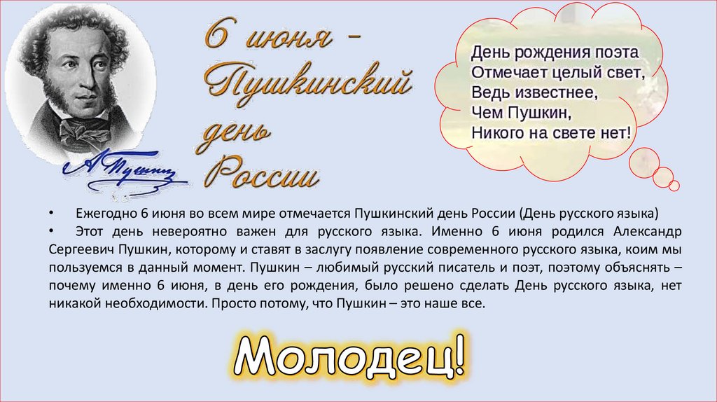 • Ежегодно 6 июня во всем мире отмечается Пушкинский день России (День русского языка)• Этот день невероятно важен для русского языка. Именно 6 июня родился Александр