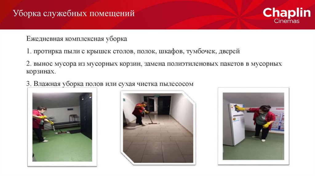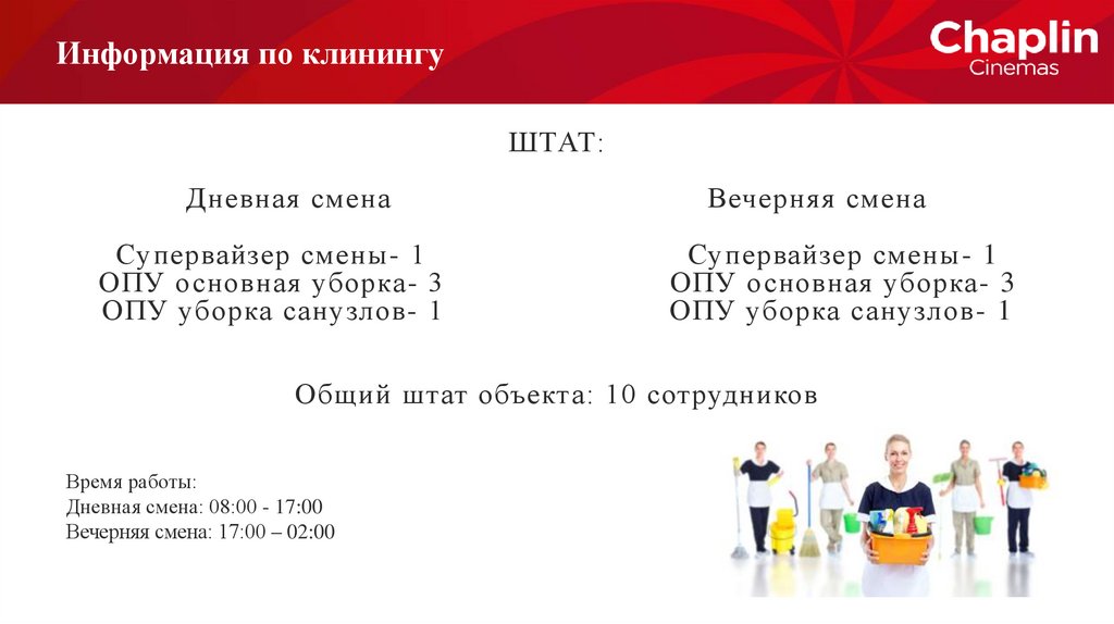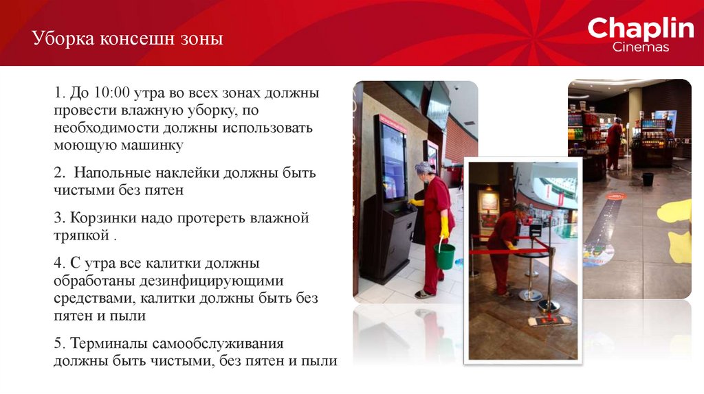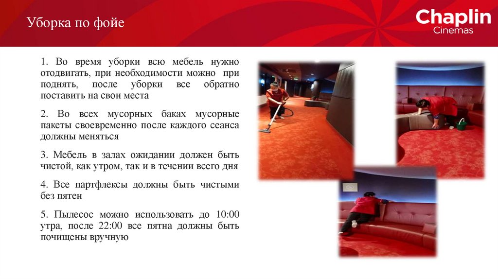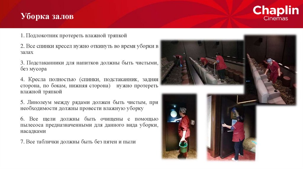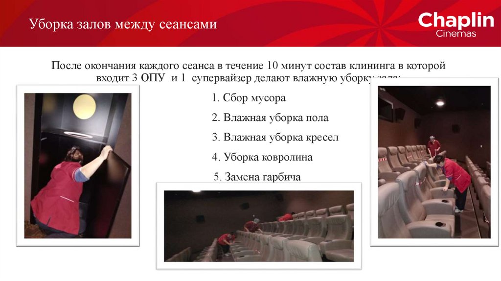 Уборка залов между сеансамиПосле окончания каждого сеанса в течение 10 минут состав клининга в которой