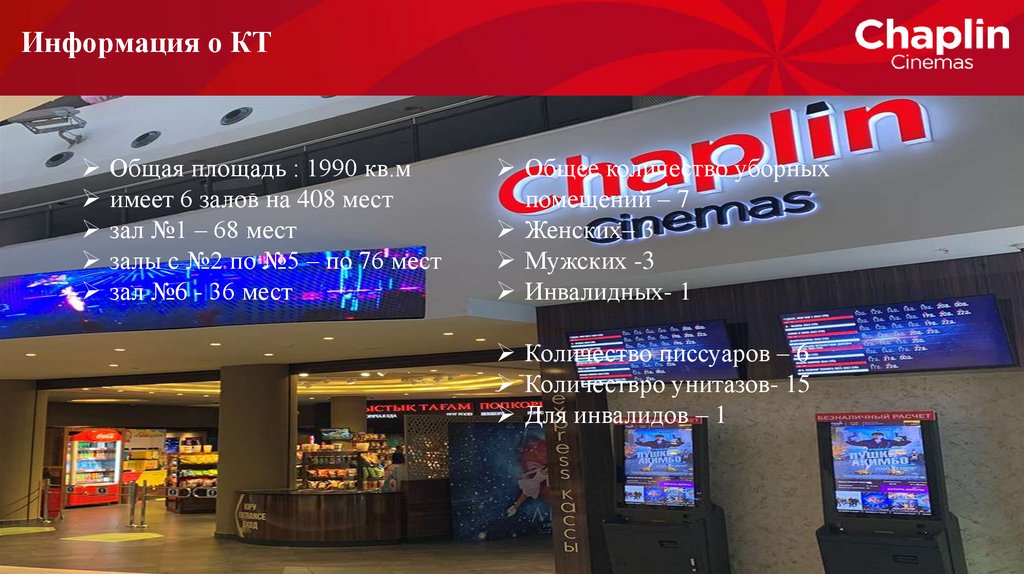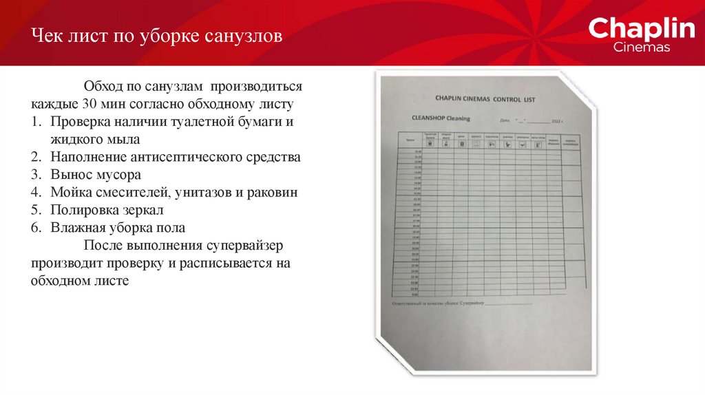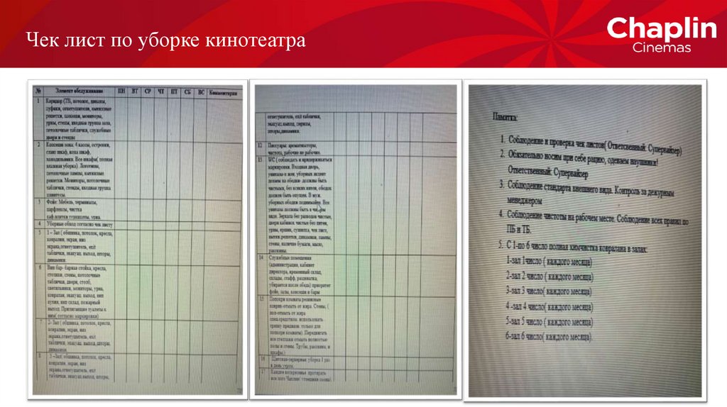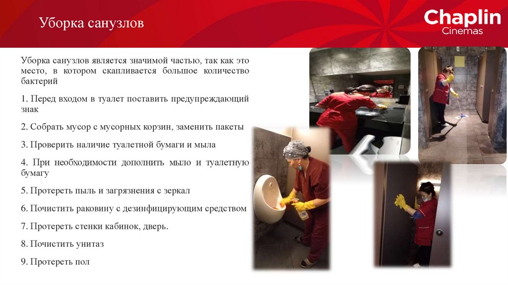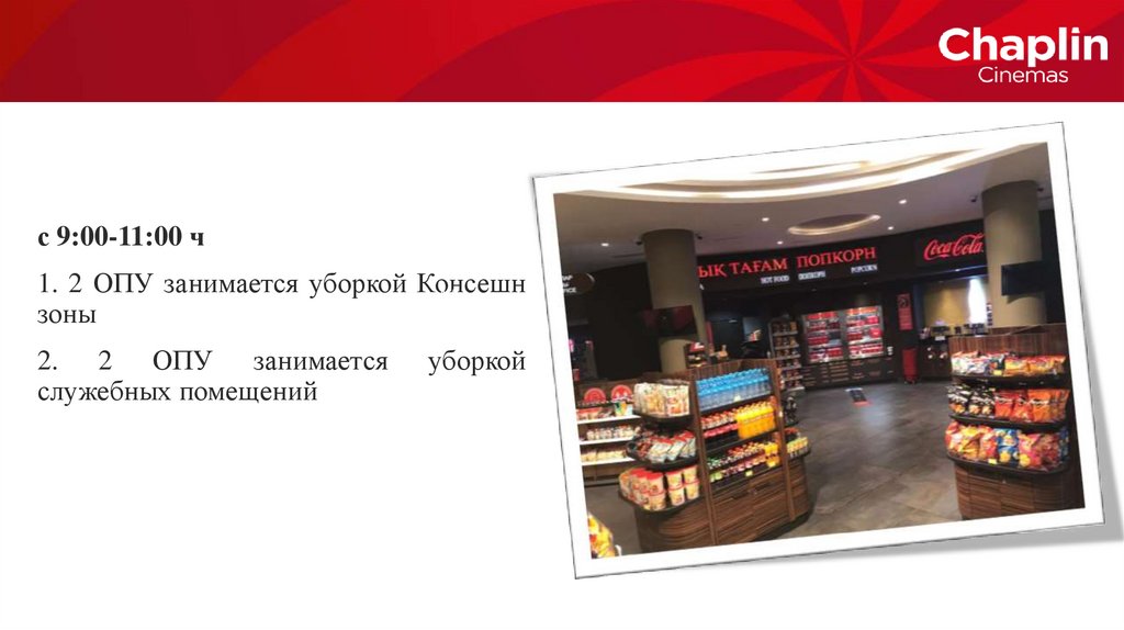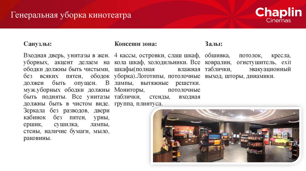 Уборка залов между сеансамиПосле окончания каждого сеанса в течение 10 минут состав клининга в которой
