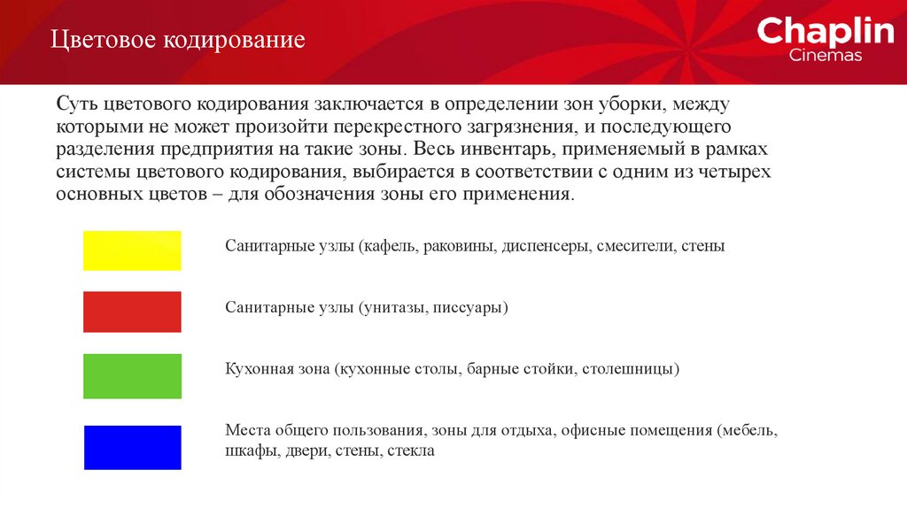 Цветовое кодированиеСуть цветового кодирования заключается в определении зон уборки, между