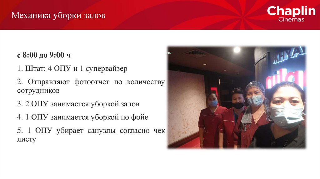 входит 3 ОПУ и 1 супервайзер делают влажную уборку зала: