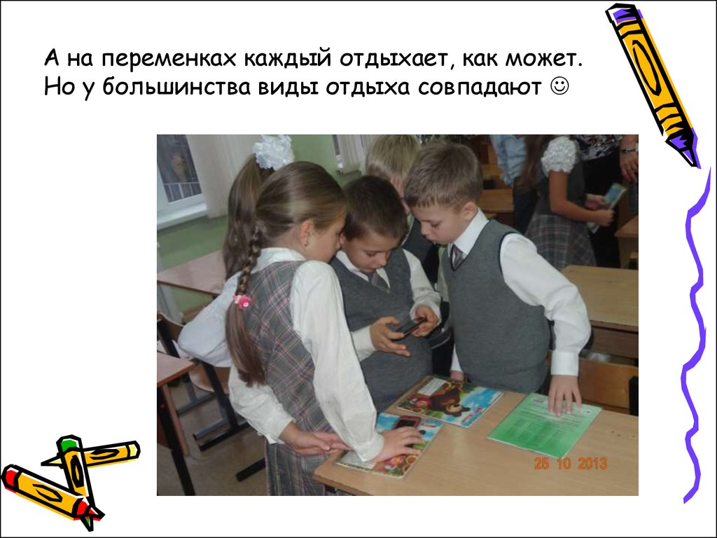 А на переменках каждый отдыхает, как может.Но у большинства виды отдыха совпадают