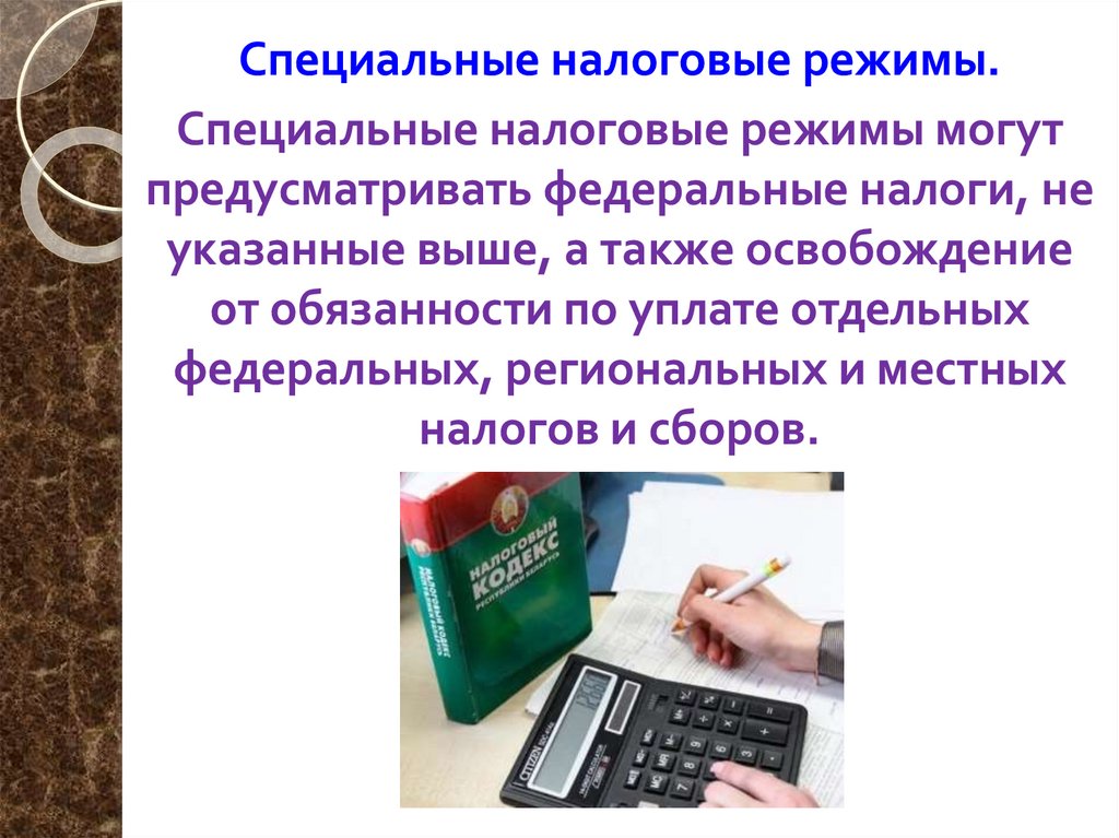 Специальные налоговые режимы.Специальные налоговые режимы могут