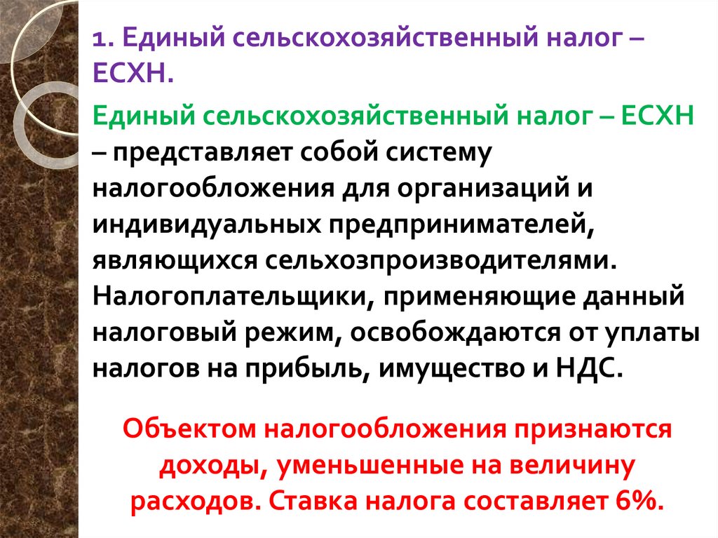 1. Единый сельскохозяйственный налог –ЕСХН.