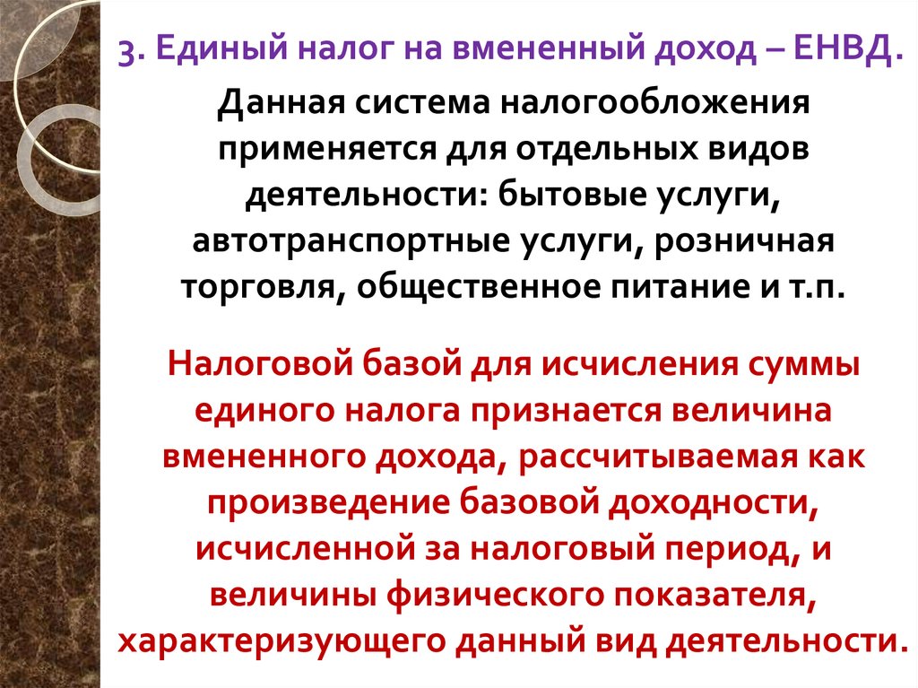 3. Единый налог на вмененный доход – ЕНВД.Данная система налогообложения