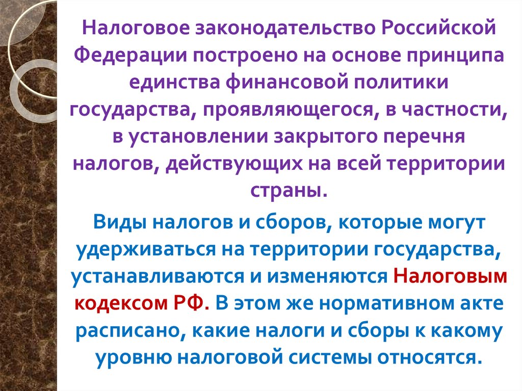 Налоговое законодательство РоссийскойФедерации построено на основе принципа