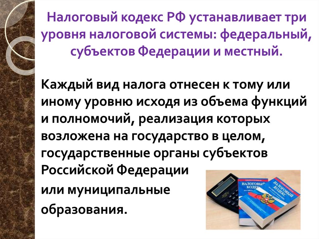 Налоговый кодекс РФ устанавливает триуровня налоговой системы: федеральный,