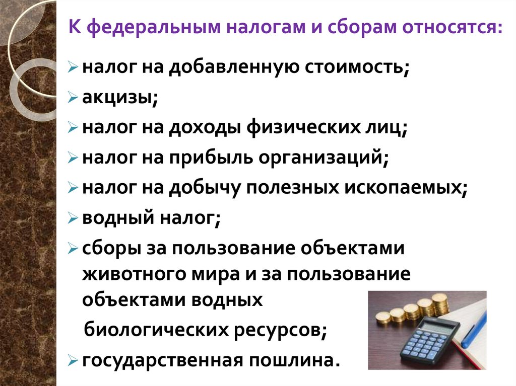 К федеральным налогам и сборам относятся:налог на добавленную стоимость;