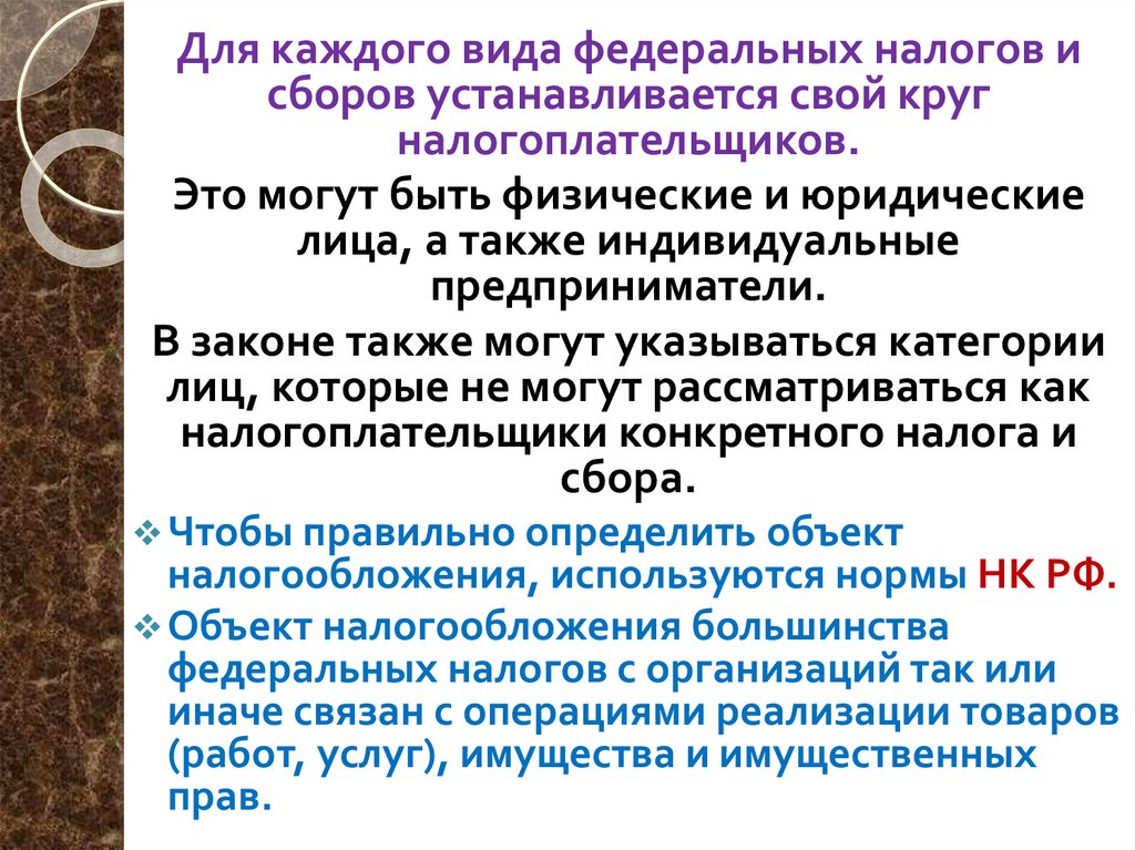 Для каждого вида федеральных налогов исборов устанавливается свой круг