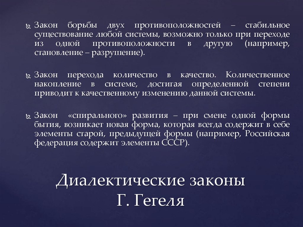 Закон борьбы двух противоположностей – стабильноесуществование любой системы, возможно только при переходе