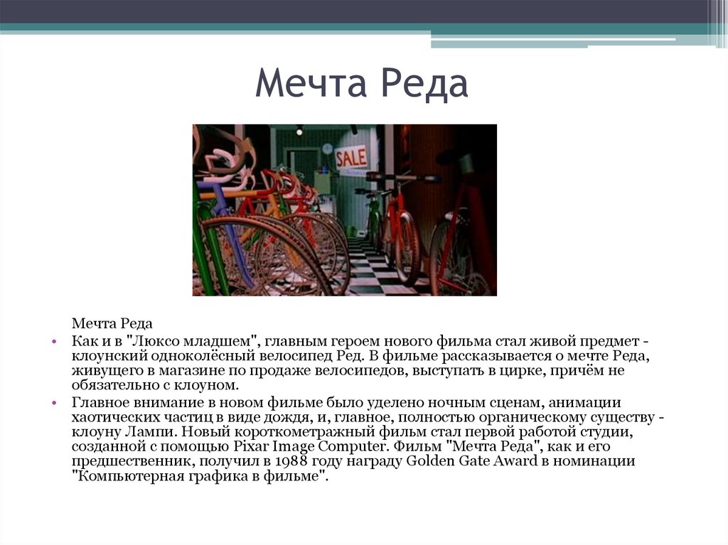 • Как и в "Люксо младшем", главным героем нового фильма стал живой предмет клоунский одноколёсный велосипед Ред. В фильме рассказывается о мечте Реда,