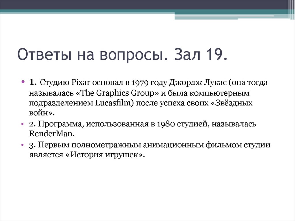Ответы на вопросы. Зал 19.• 1. Студию Pixar основал в 1979 году Джордж Лукас (она тогда