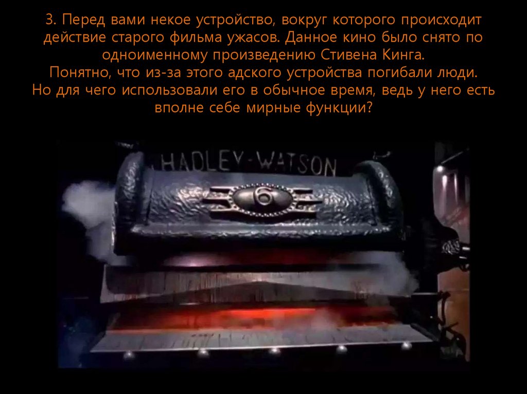 3. Перед вами некое устройство, вокруг которого происходитдействие старого фильма ужасов. Данное кино было снято по