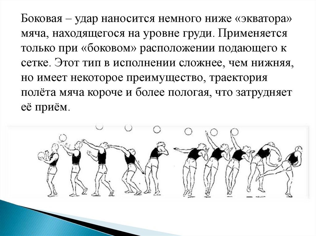 Боковая – удар наносится немного ниже «экватора»мяча, находящегося на уровне груди. Применяется