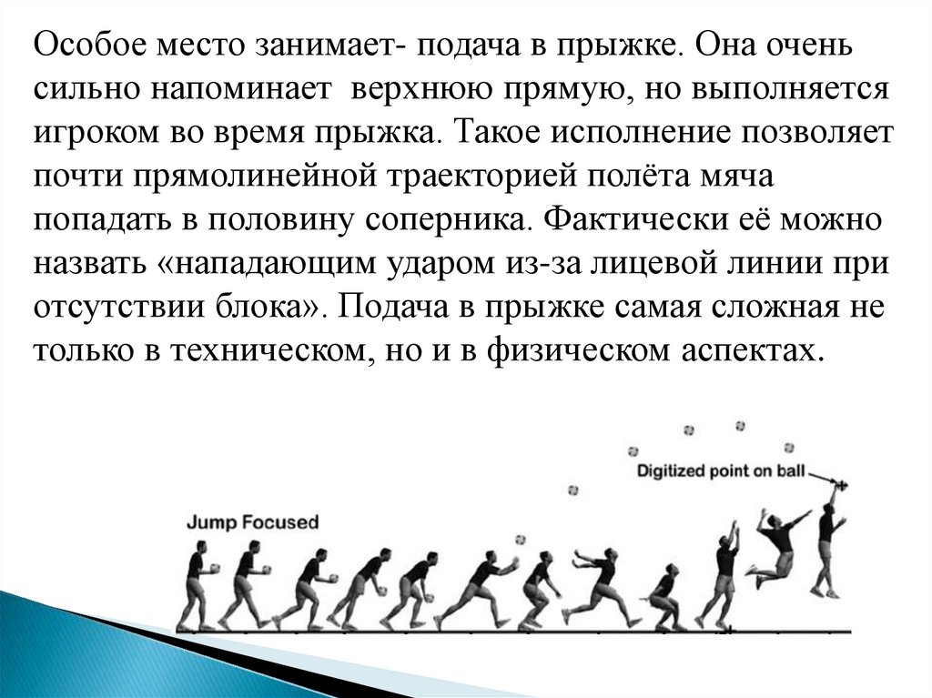 Особое место занимает- подача в прыжке. Она оченьсильно напоминает верхнюю прямую, но выполняется
