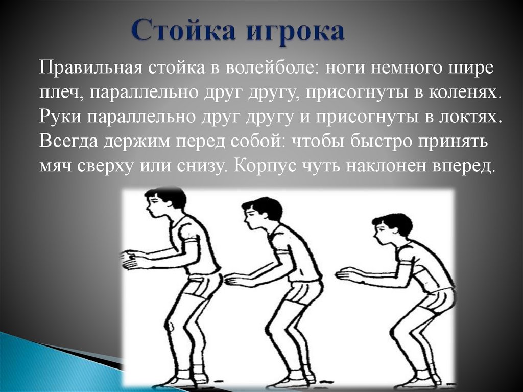 Правильная стойка в волейболе: ноги немного ширеплеч, параллельно друг другу, присогнуты в коленях.