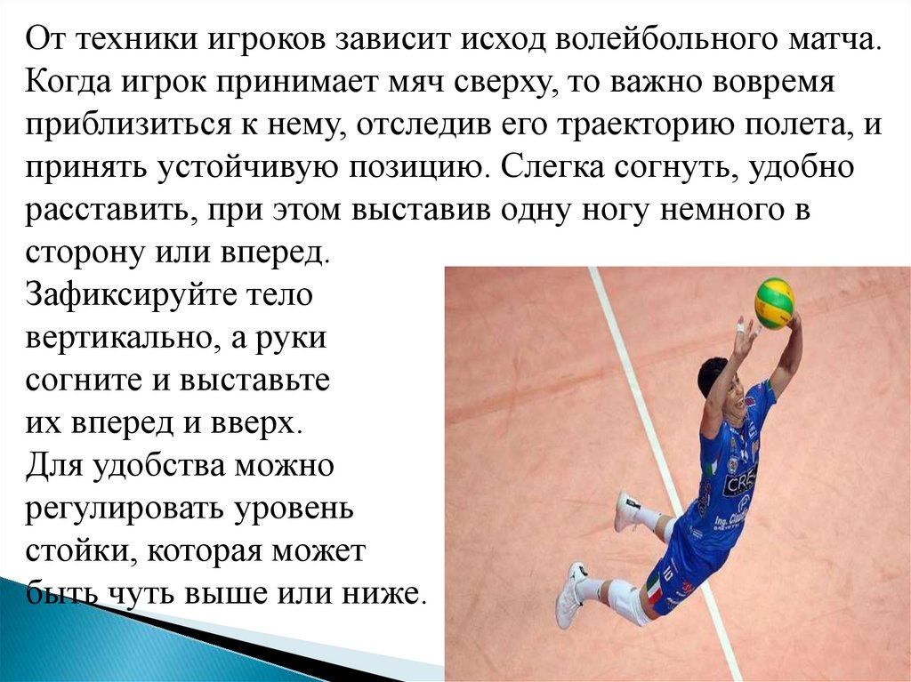 От техники игроков зависит исход волейбольного матча.Когда игрок принимает мяч сверху, то важно вовремя