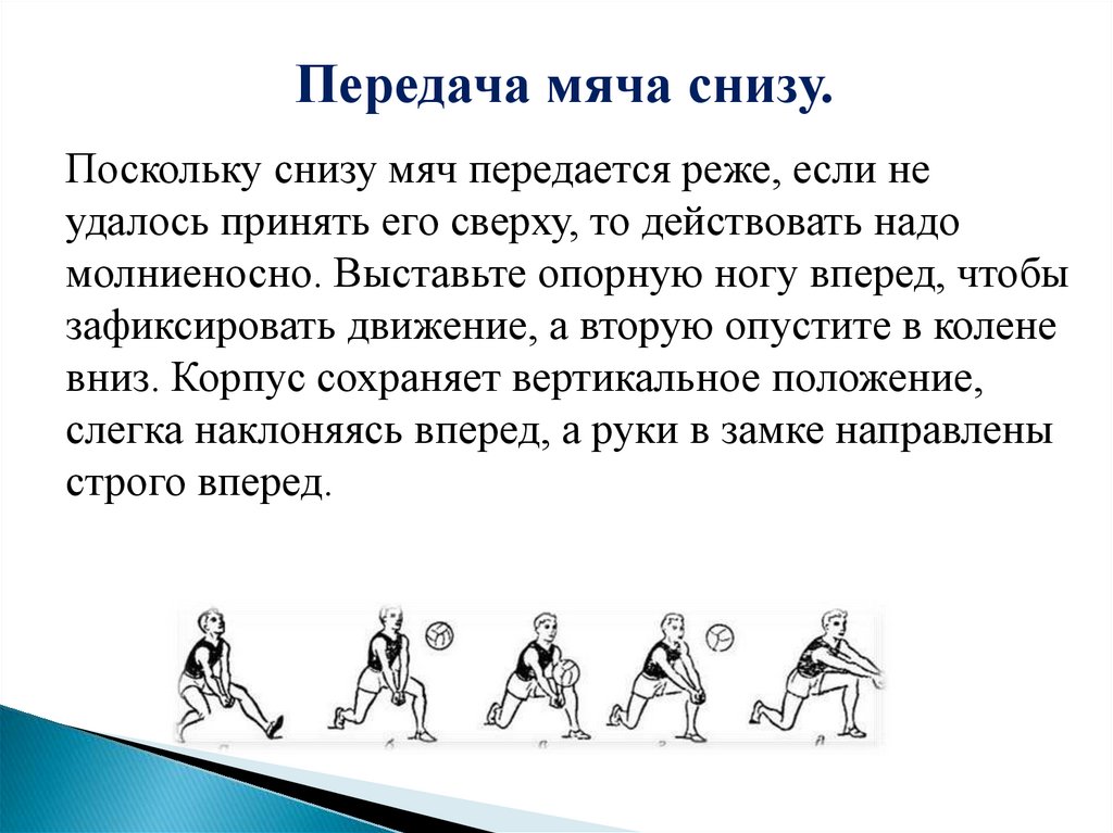 Передача мяча снизу.Поскольку снизу мяч передается реже, если не
