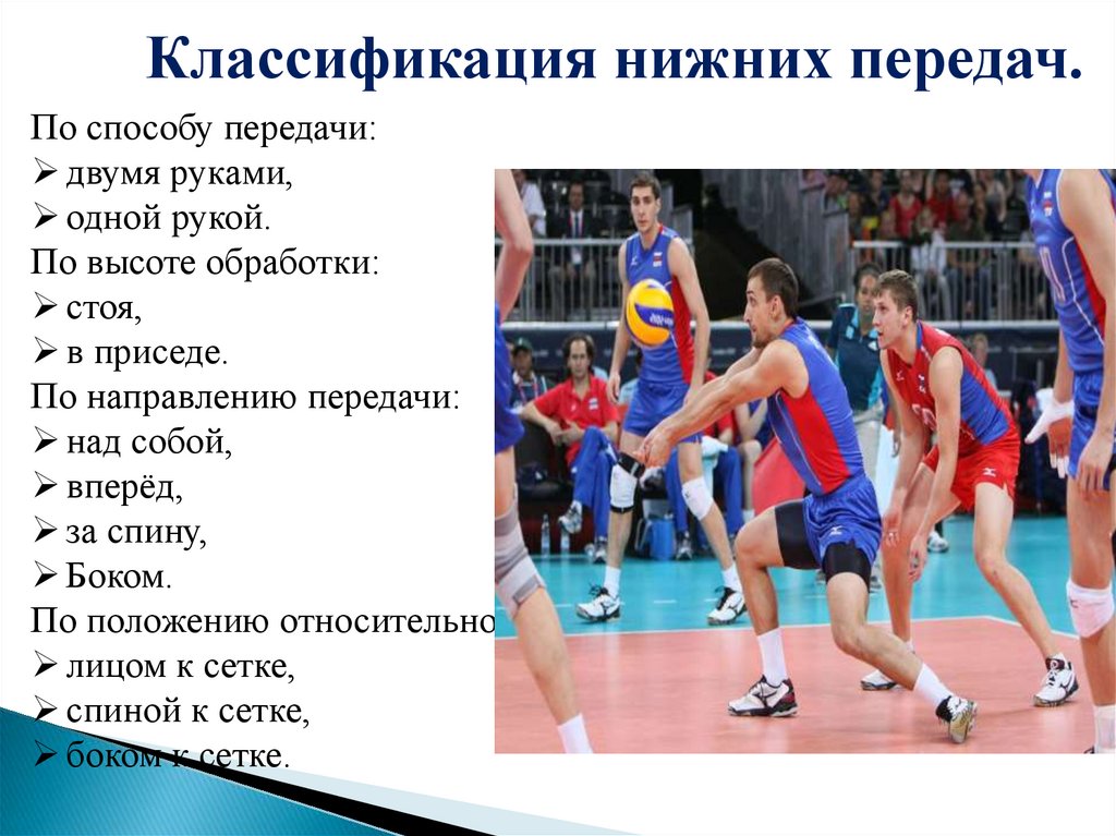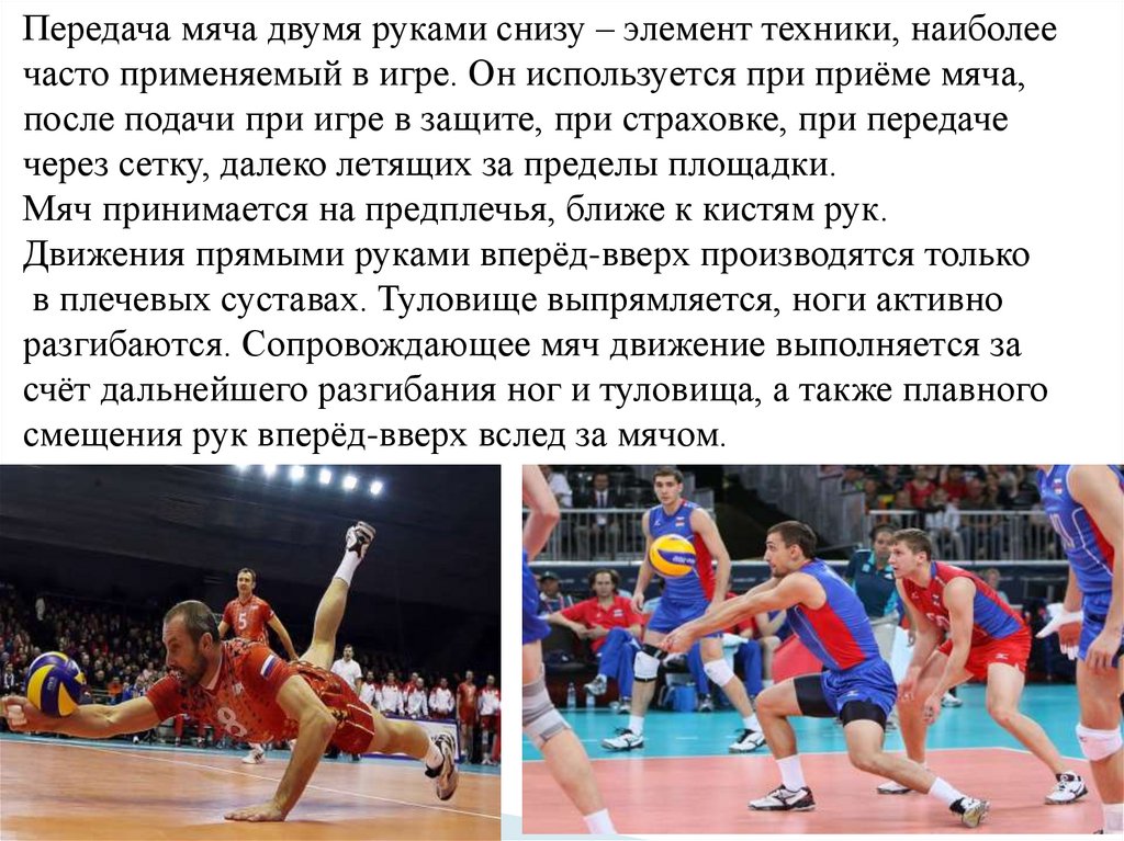 Передача мяча двумя руками снизу – элемент техники, наиболеечасто применяемый в игре. Он используется при приёме мяча,