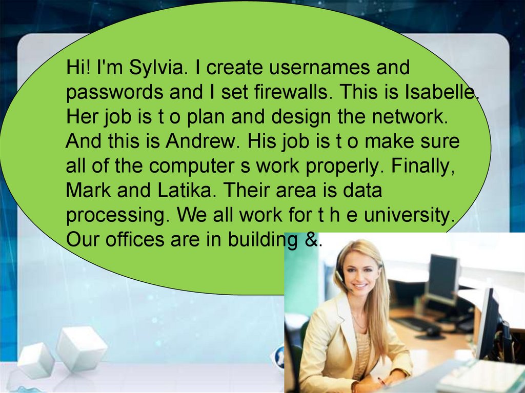 Hi! I'm Sylvia. I create usernames andpasswords and I set firewalls. This is Isabelle.