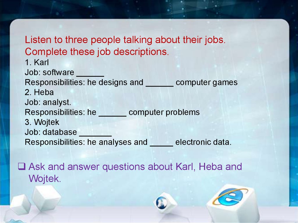 Listen to three people talking about their jobs.Complete these job descriptions.