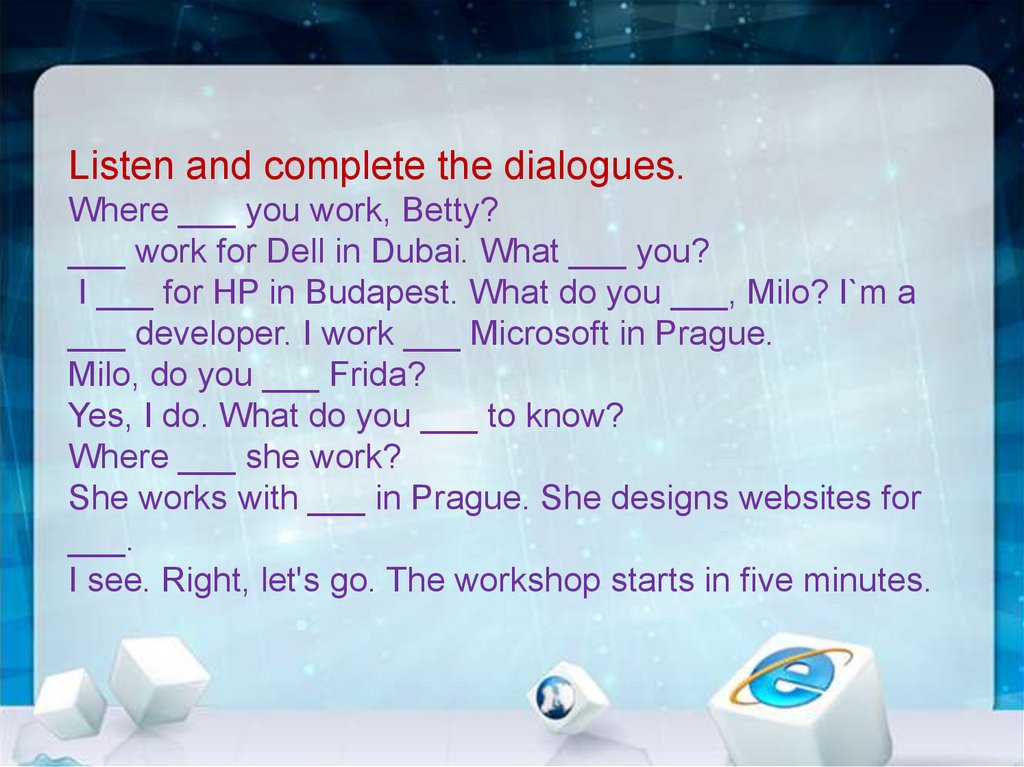 Listen and complete the dialogues.Where ___ you work, Betty?
