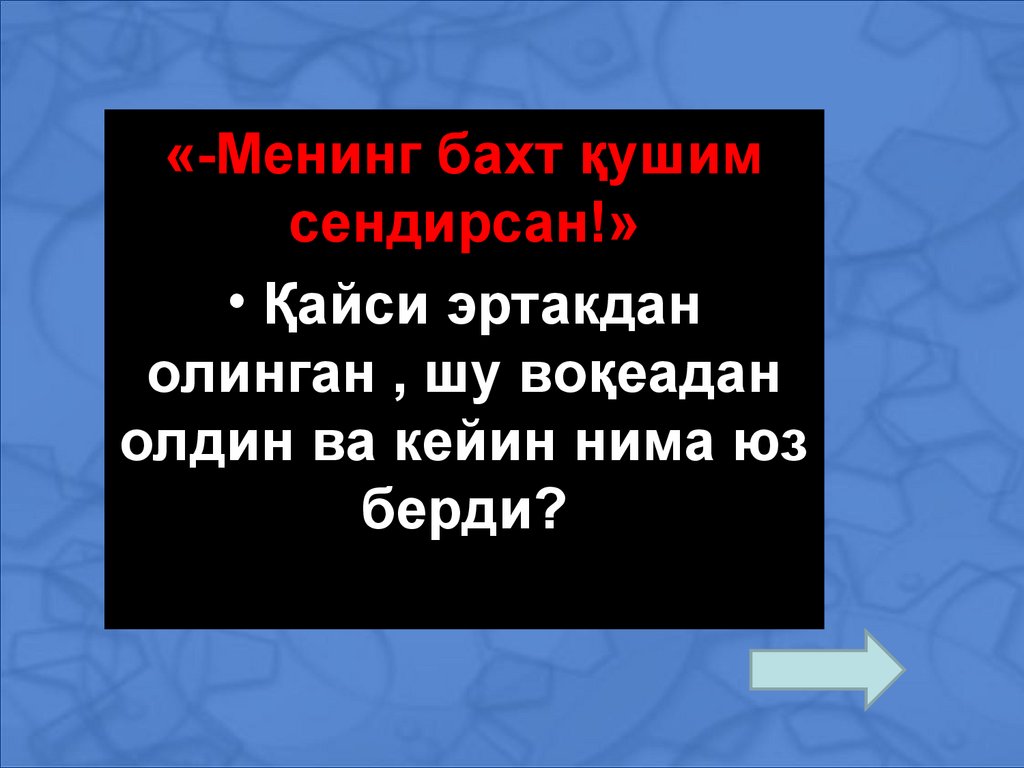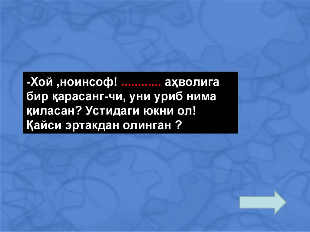 -Хой ,ноинсоф! ............ аҳволигабир қарасанг-чи, уни уриб нима