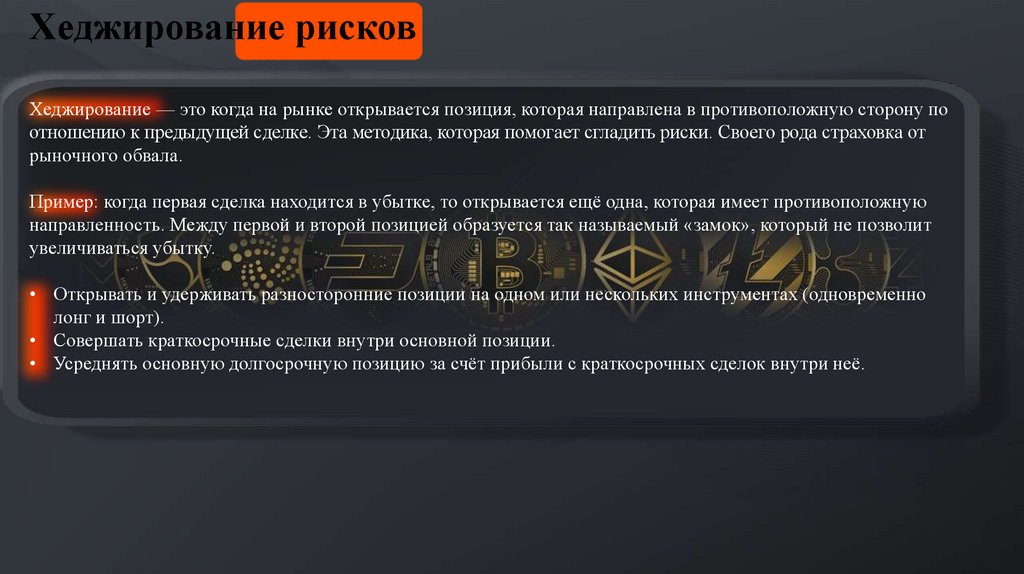 Хеджирование рисковХеджирование — это когда на рынке открывается позиция, которая направлена в противоположную сторону по