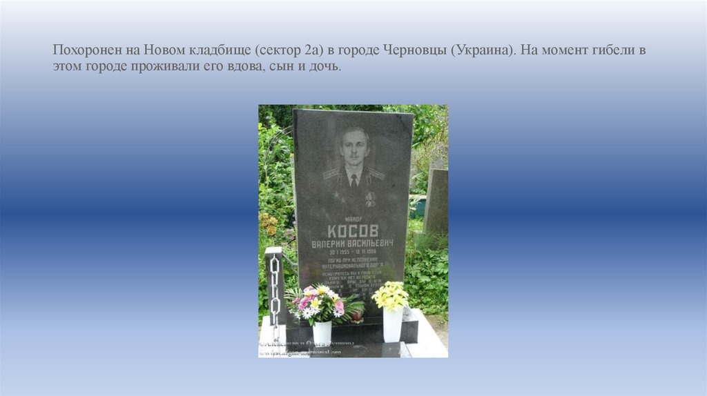 Похоронен на Новом кладбище (сектор 2а) в городе Черновцы (Украина). На момент гибели вэтом городе проживали его вдова, сын и дочь.