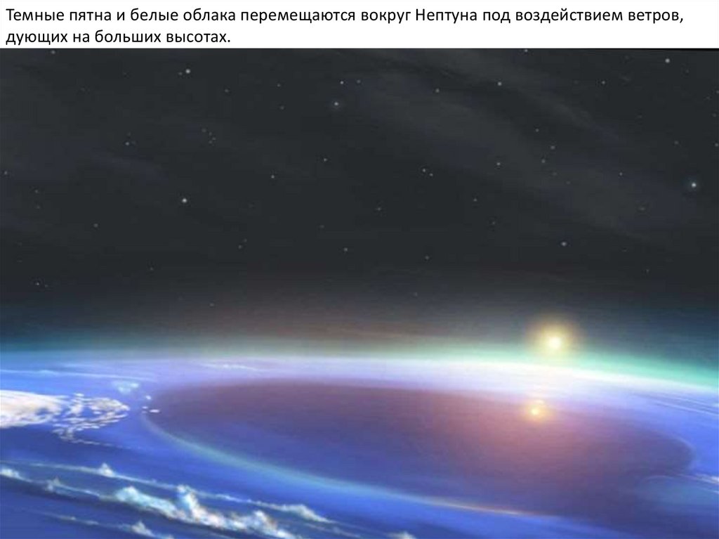 Темные пятна и белые облака перемещаются вокруг Нептуна под воздействием ветров,дующих на больших высотах.