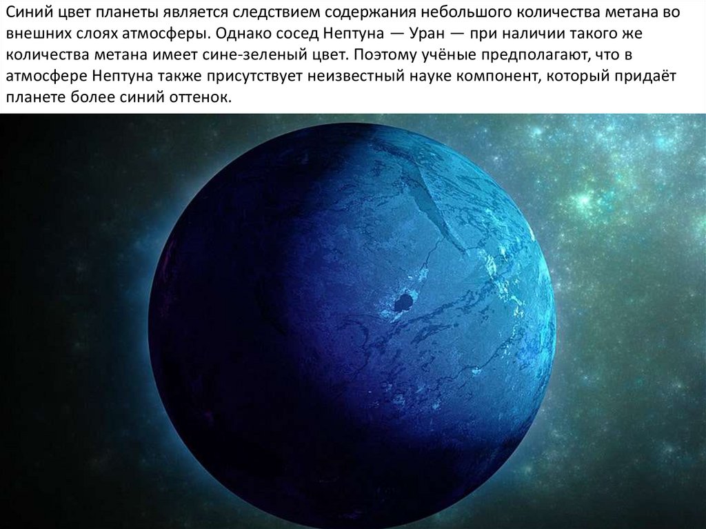 Синий цвет планеты является следствием содержания небольшого количества метана вовнешних слоях атмосферы. Однако сосед Нептуна — Уран — при наличии такого же