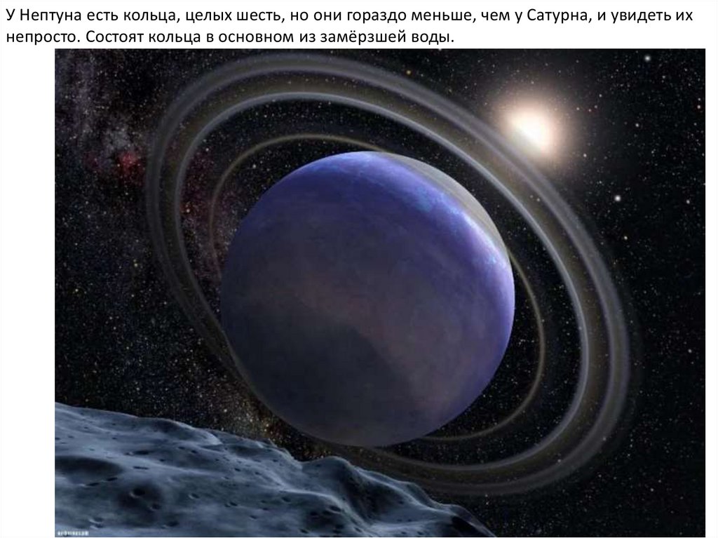 У Нептуна есть кольца, целых шесть, но они гораздо меньше, чем у Сатурна, и увидеть ихнепросто. Состоят кольца в основном из замёрзшей воды.