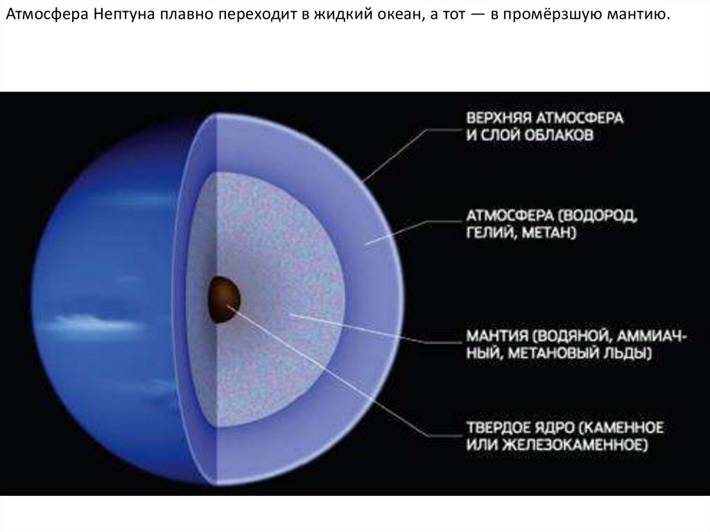 Атмосфера Нептуна плавно переходит в жидкий океан, а тот — в промёрзшую мантию.6.