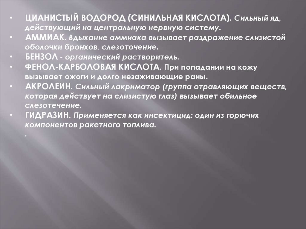 •НИТРОБЕНЗОЛ. При вдыхании больших концентраций - почтимгновенная потеря сознания и смерть в течение нескольких минут