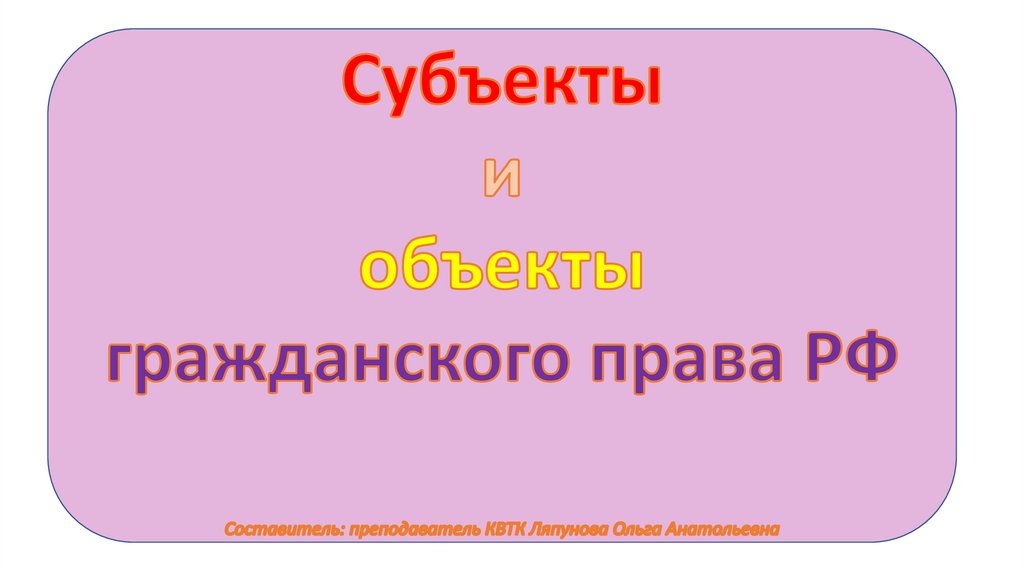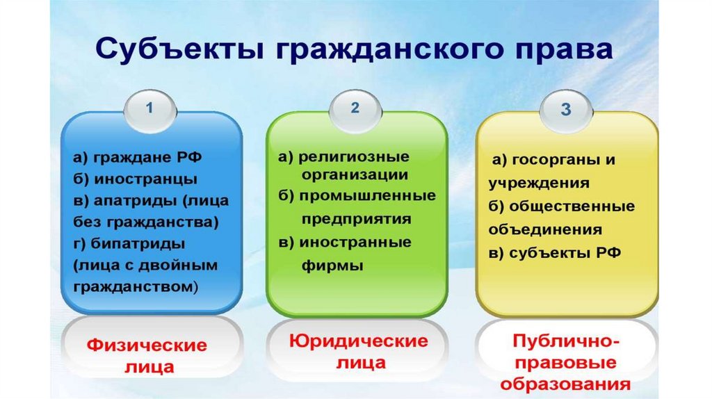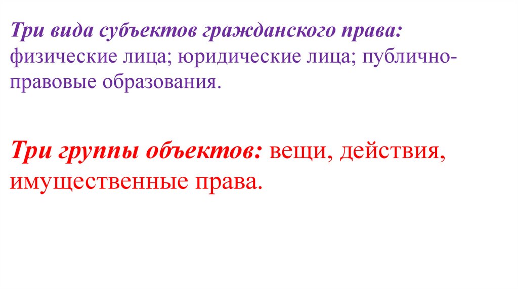 Три вида субъектов гражданского права:физические лица; юридические лица; публичноправовые образования.