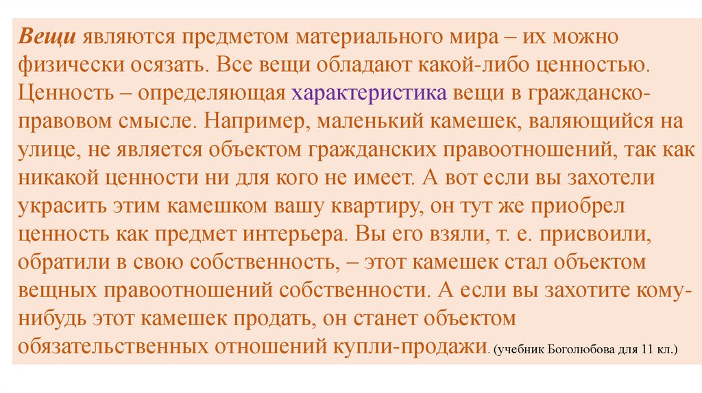 вещных правоотношений собственности. А если вы захотите комунибудь этот камешек продать, он станет объектом