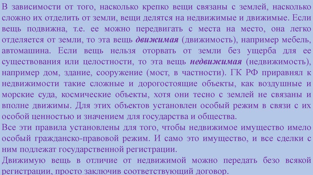 В зависимости от того, насколько крепко вещи связаны с землей, насколькосложно их отделить от земли, вещи делятся на недвижимые и движимые. Если