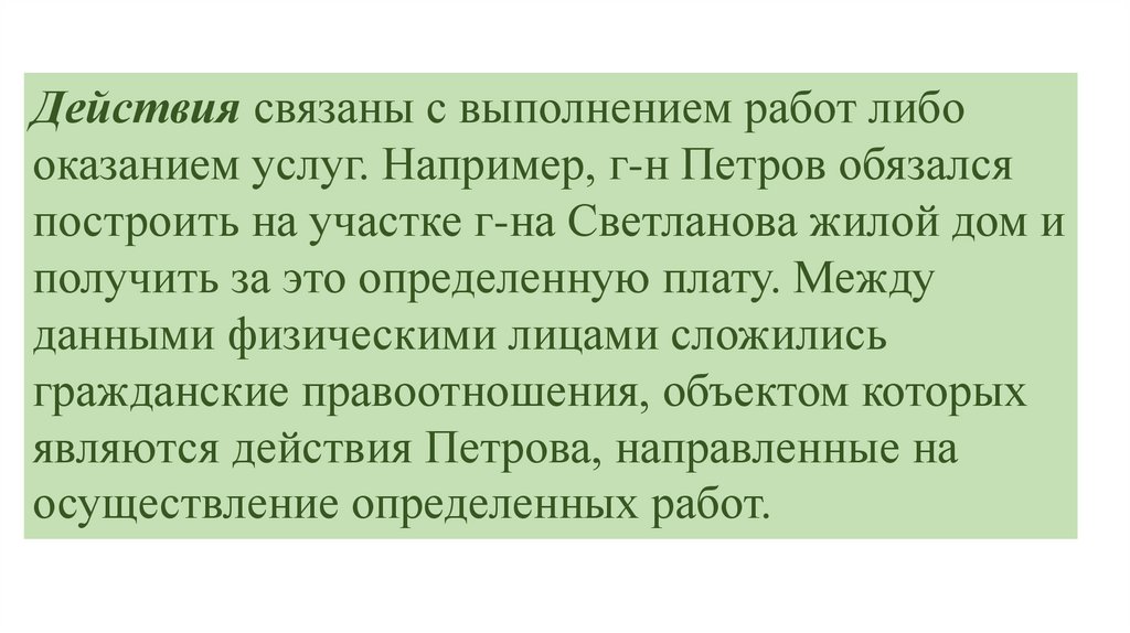 Действия связаны с выполнением работ либооказанием услуг. Например, г-н Петров обязался