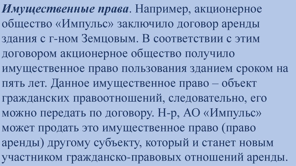 Имущественные права. Например, акционерноеобщество «Импульс» заключило договор аренды