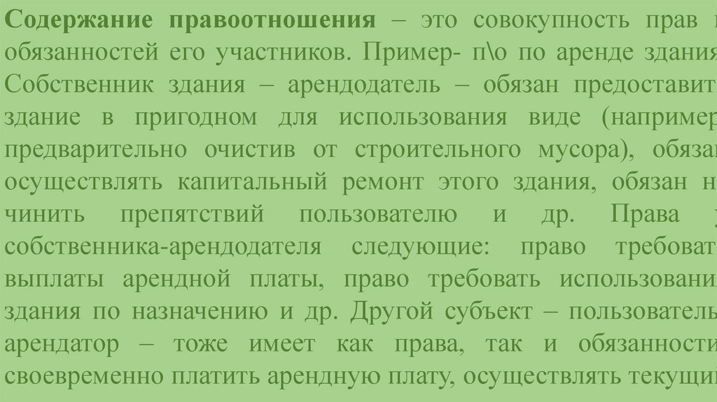 Содержание правоотношения – это совокупность прав иобязанностей его участников. Пример- п\о по аренде здания