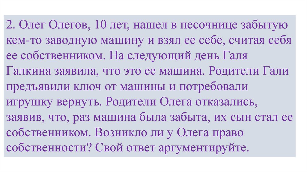 2. Олег Олегов, 10 лет, нашел в песочнице забытуюкем-то заводную машину и взял ее себе, считая себя