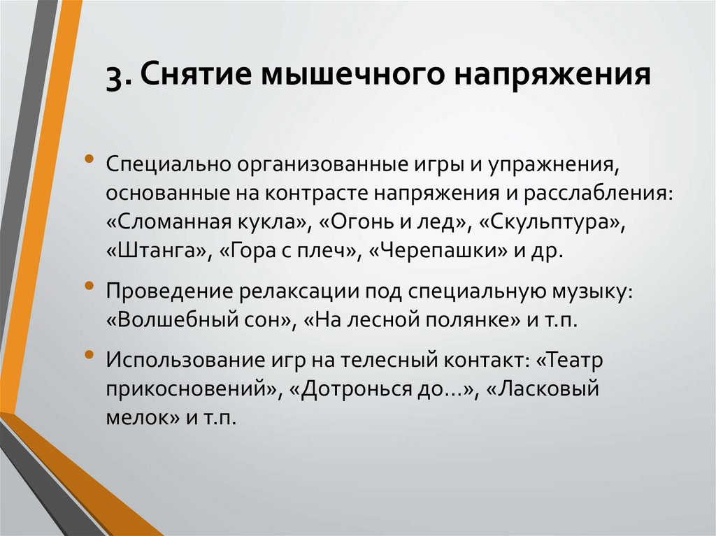 3. Снятие мышечного напряжения• Специально организованные игры и упражнения,