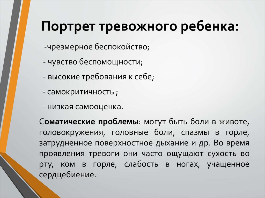 Портрет тревожного ребенка:-чрезмерное беспокойство;