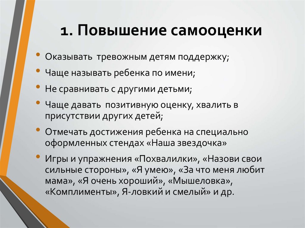1. Повышение самооценки• Оказывать тревожным детям поддержку;