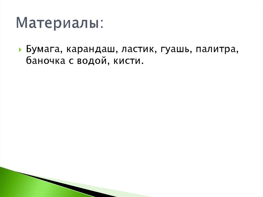 Бумага, карандаш, ластик, гуашь, палитра,