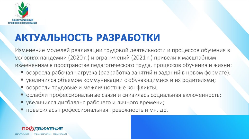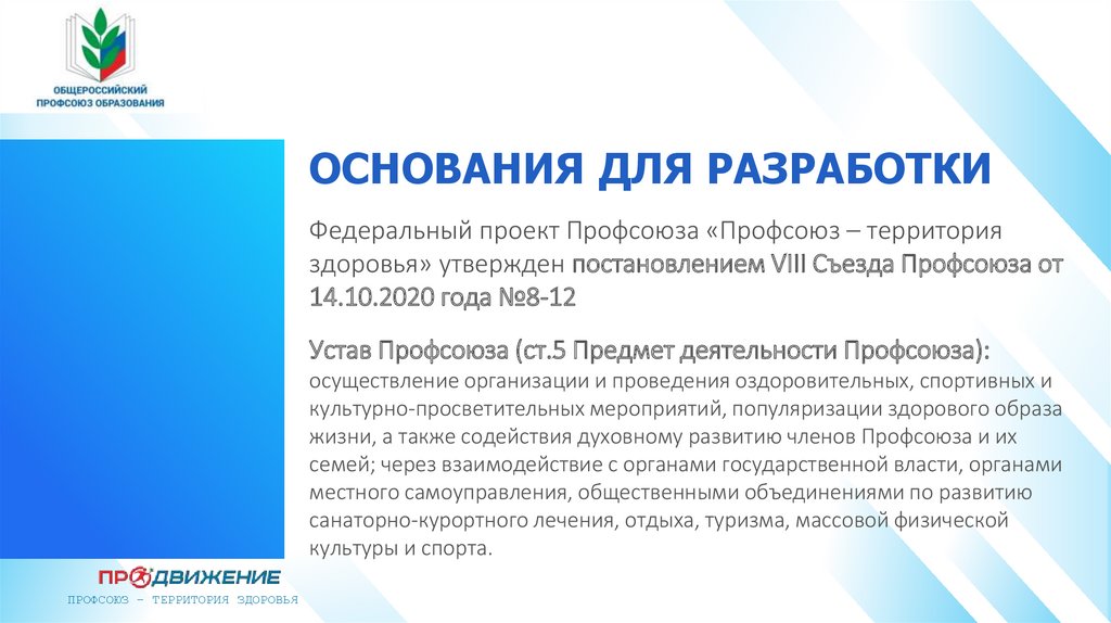 ОСНОВАНИЯ ДЛЯ РАЗРАБОТКИФедеральный проект Профсоюза «Профсоюз – территория